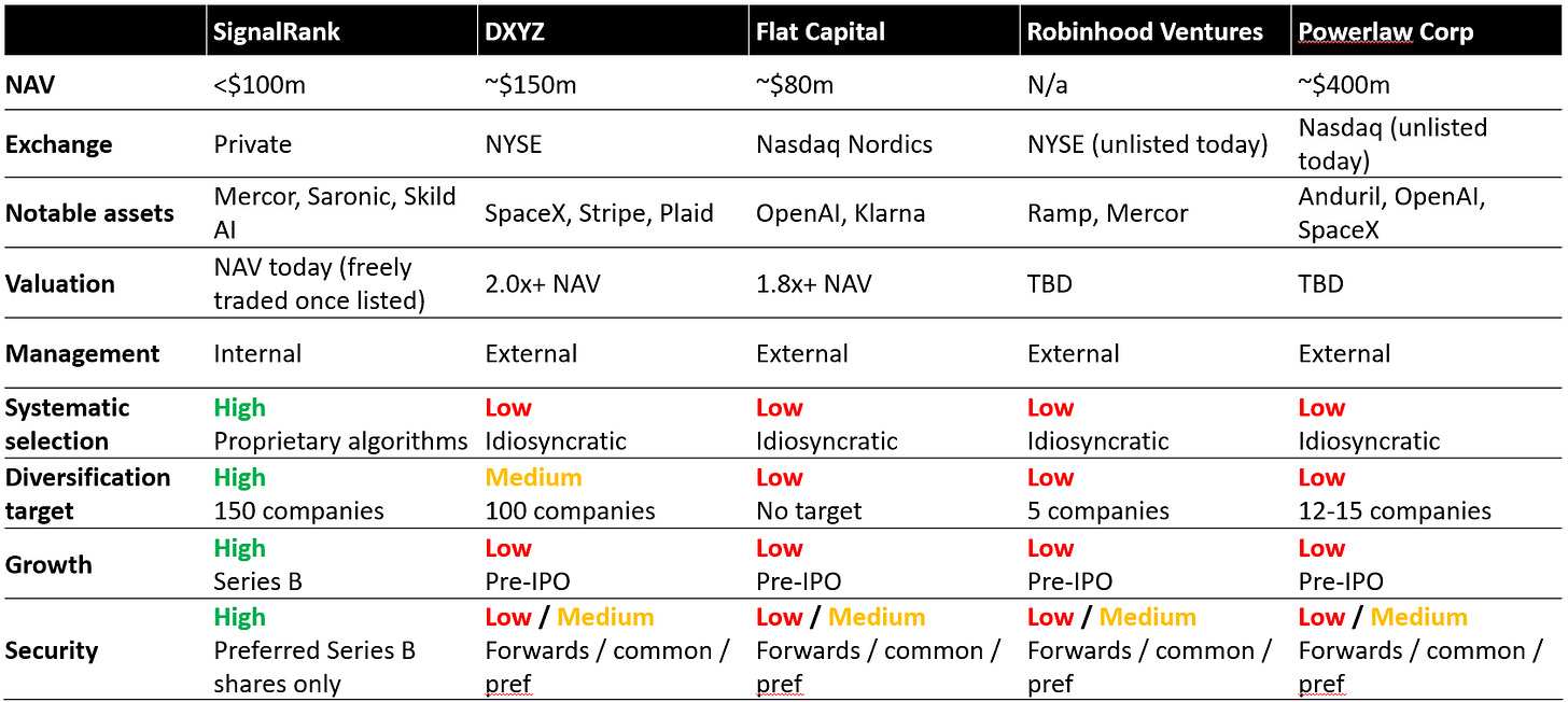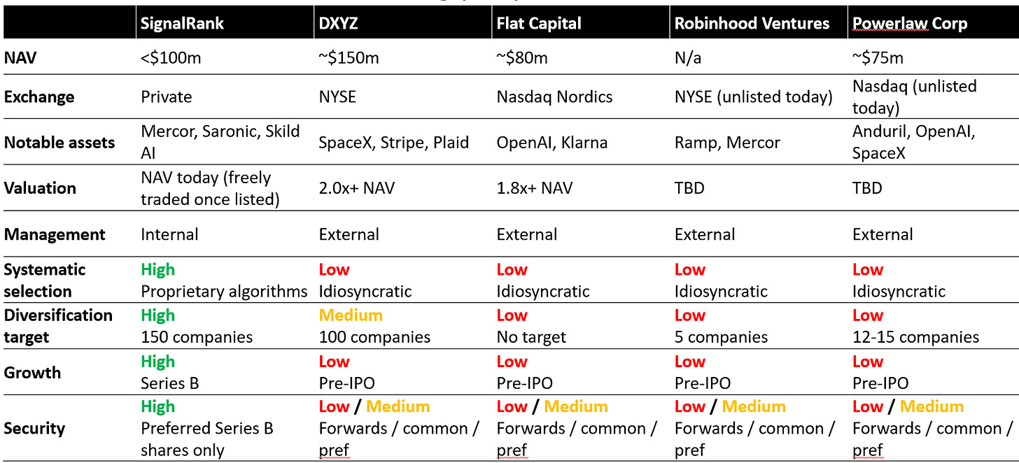 Instead, we are seeing more managers opt for an exchange traded CEF model. DXYZ & Flat Capital have this structure, as will the recently announced Robinhood Ventures and Powerlaw Corp. SignalRank is actively exploring this path forward as well.